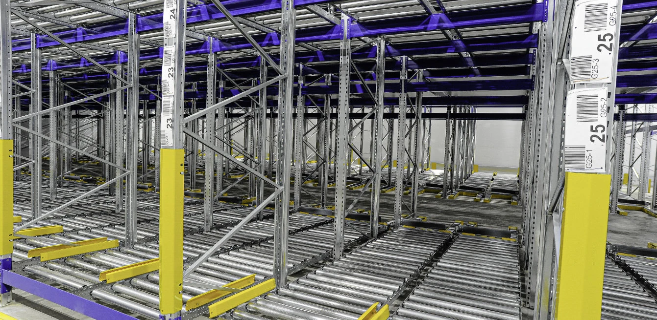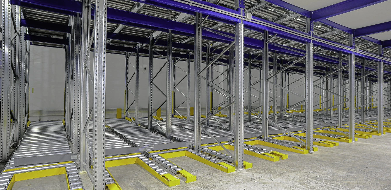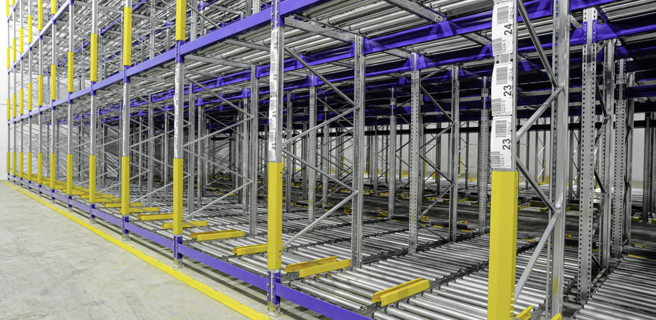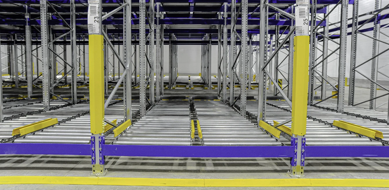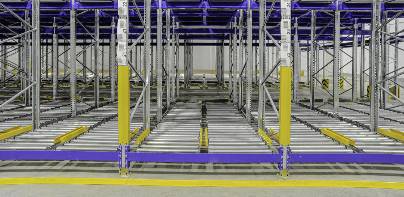 В структуре гравитационного стеллажа предусмотрены сменяющие друг друга инерционные и обычные ролики, что позволяет контролировать скорость движения товара. Благодаря механизму тормозов в области выгрузки не оказывается давление на первый паллет.