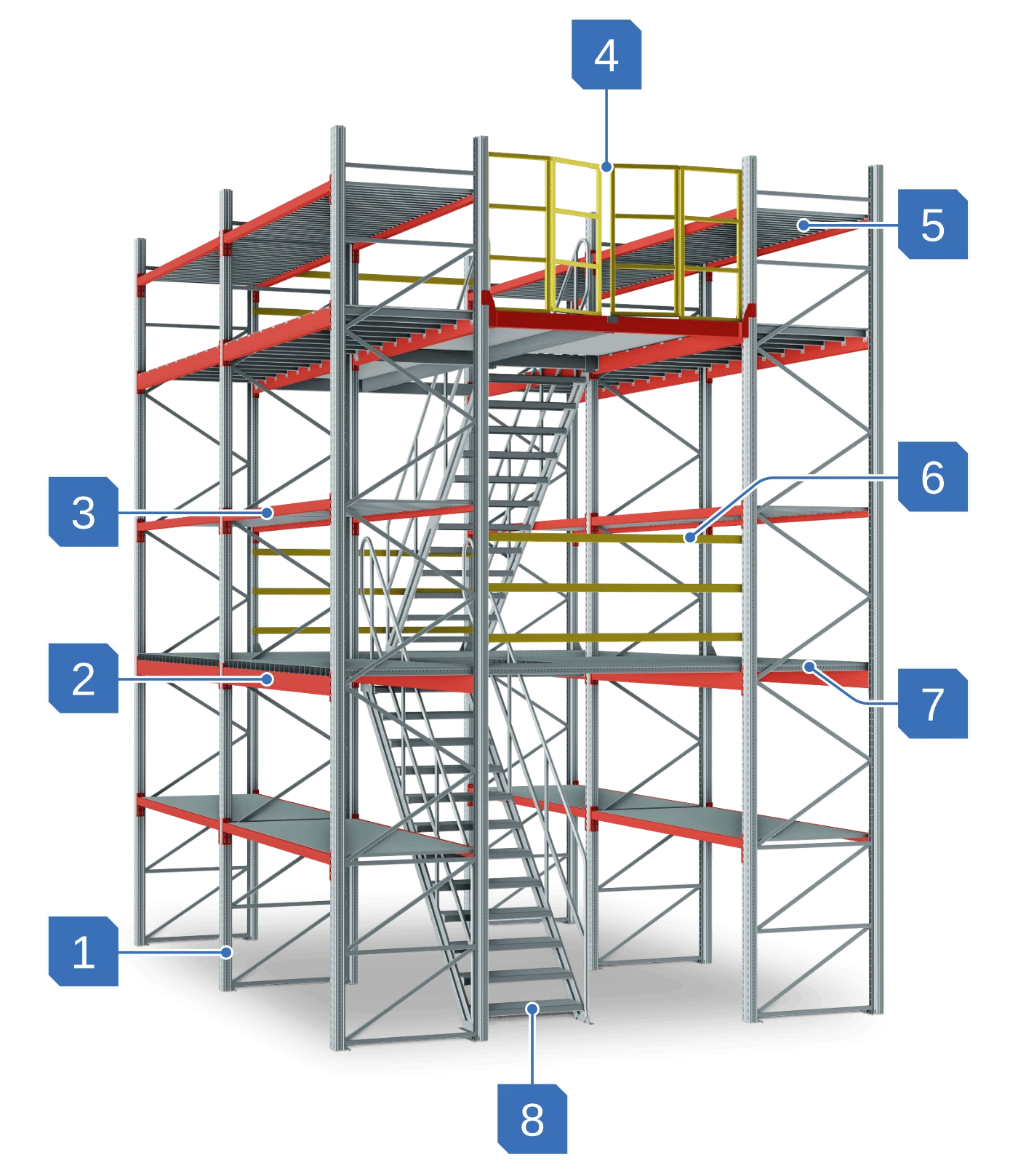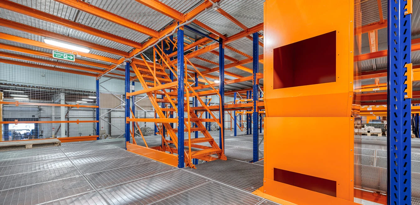 - Простота сборки и перепланировки. Безболтовая система зацепов конструкции мезонина обеспечивает достаточно быструю сборку или перепланировку уровней хранения. При необходимости мезонин можно разобрать и вновь собрать на новом складе.