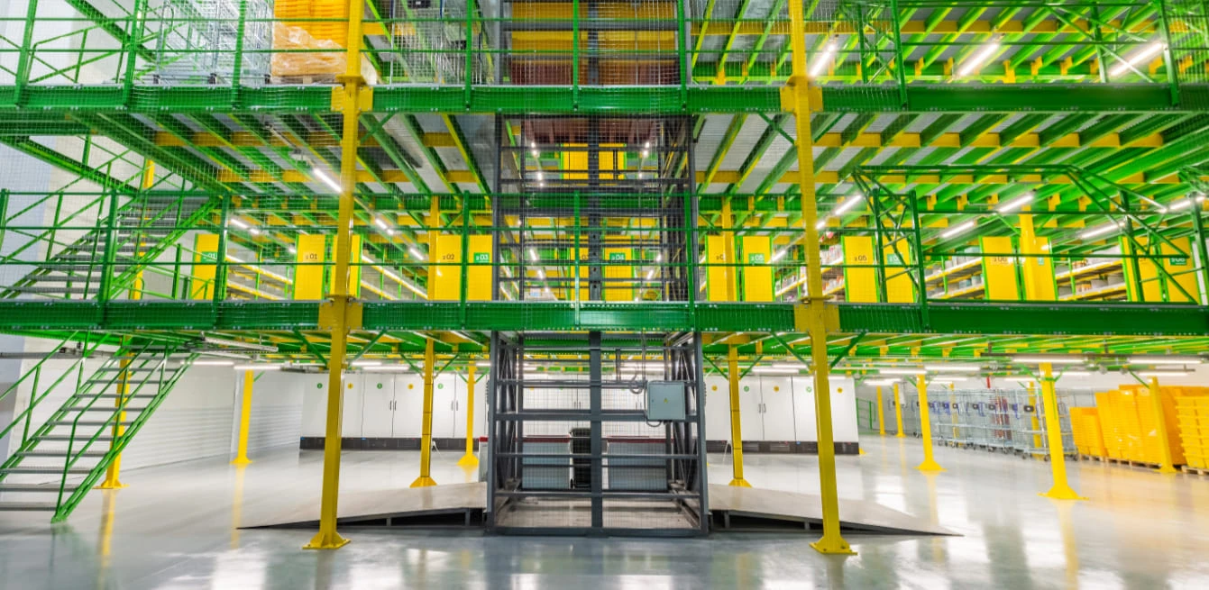- Для повышения эффективности мезонина в зонах комплектации могут быть организованы дополнительные операции, размещены рабочие места, поставлены конвейеры для перемещения грузов между этажами и зонами мезонина, встроены подъемники и лифты.