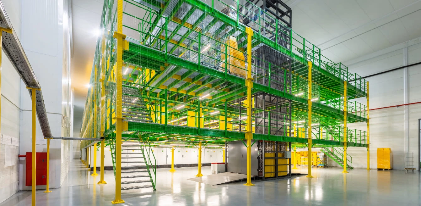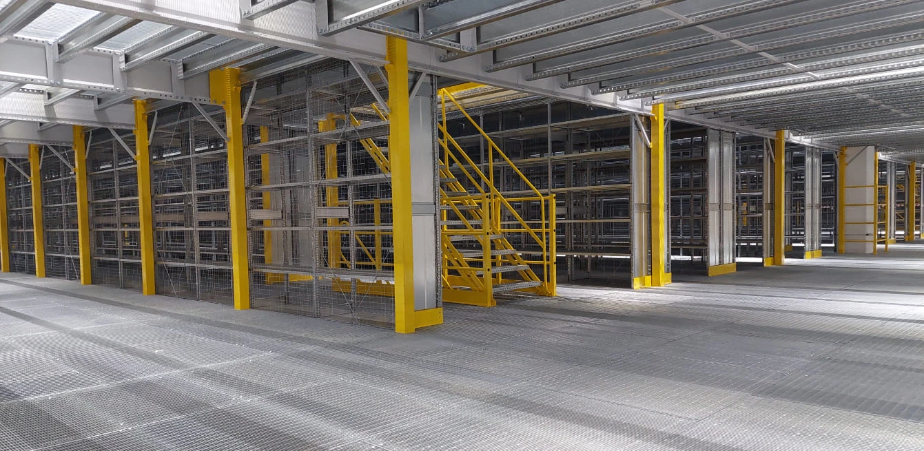 Мезонин на колоннах – многоэтажная конструкция, которая помогает увеличить полезную площадь склада или производственного помещения. Система является универсальной и подходит для крупных и нестандартных по габаритам грузов или паллет, хранимых на полу. Конструкция мезонинных платформ является несущей и прочной, что позволяет организовывать на них зоны под офисные помещения и одновременно использовать для хранения продукции.