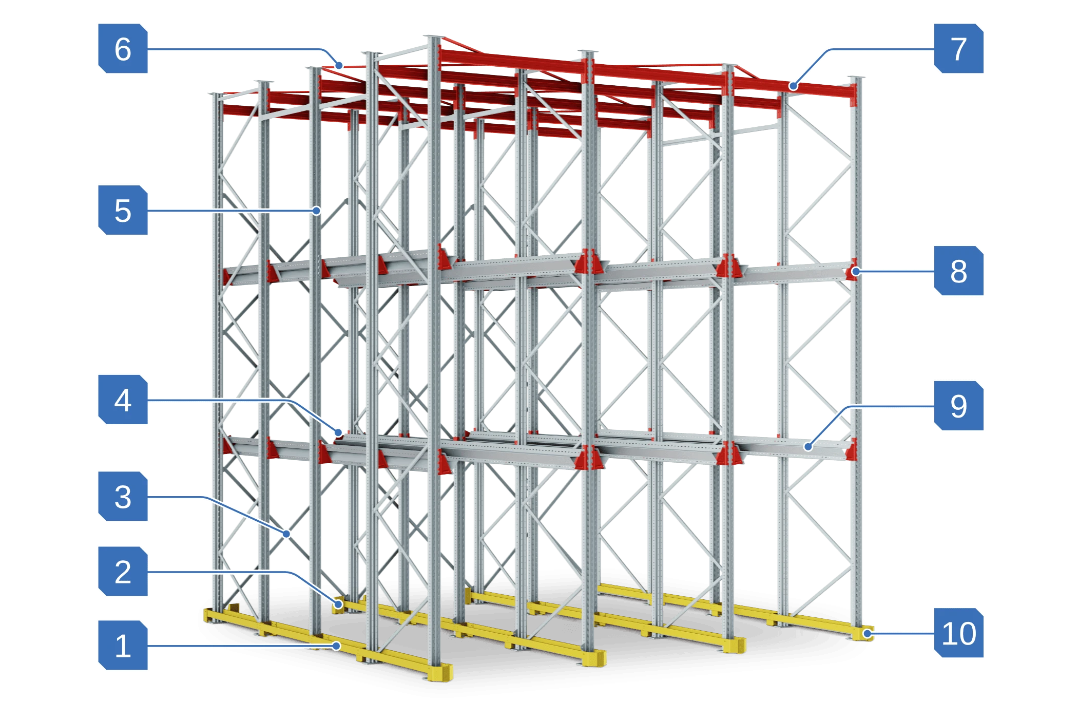 Глубинные стеллажи представляют собой жесткую конструкцию из вертикальных рам, скрепленную горизонтальными балками, с системой направляющих - ложементов. На ложементы устанавливаются поддоны с грузом. Шаг рам глубинного стеллажа выбирается в зависимости от веса складируемого груза и необходимого количества паллет в ряду.