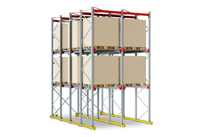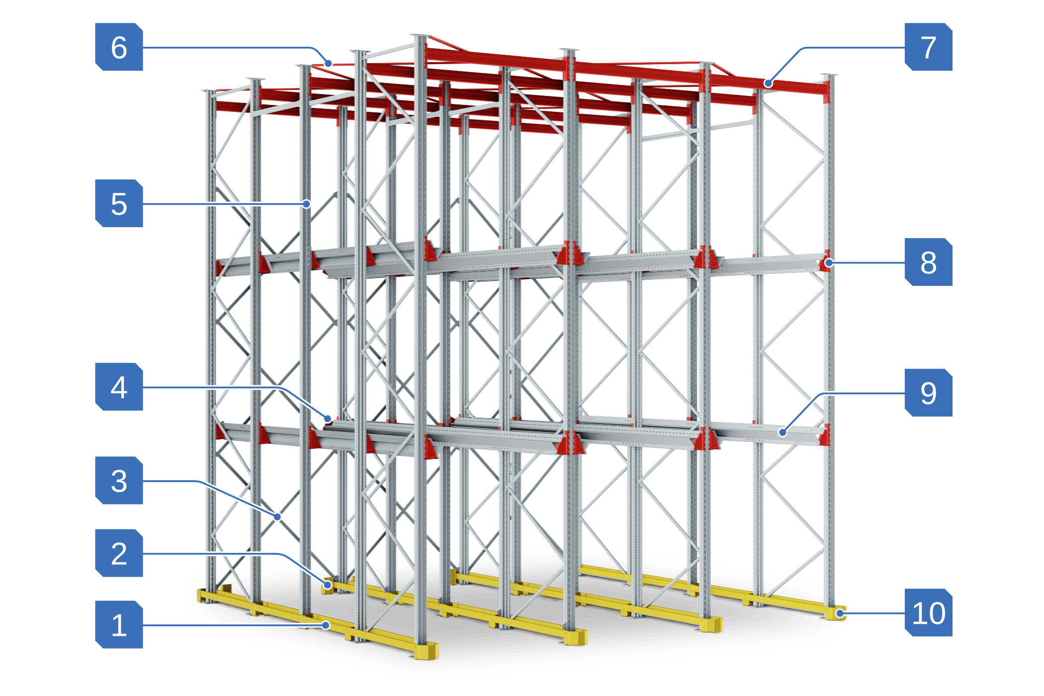 Глубинные стеллажи представляют собой жесткую конструкцию из вертикальных рам, скрепленную горизонтальными балками, с системой направляющих - ложементов. На ложементы устанавливаются поддоны с грузом. Шаг рам глубинного стеллажа выбирается в зависимости от веса складируемого груза и необходимого количества паллет в ряду.